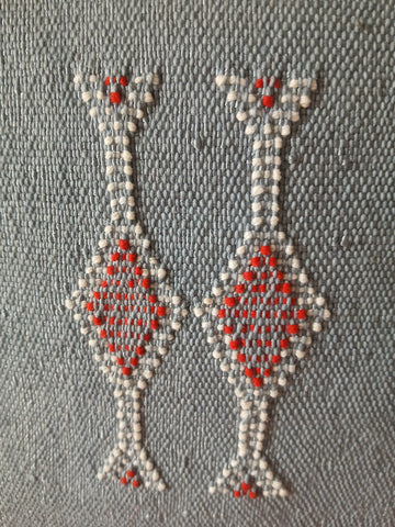 The pillow features ancient symbolic Berber motifs from Morocco’s High Atlas Mountains. and has a Hand sown interlaced fringe with a tassel on each corner.