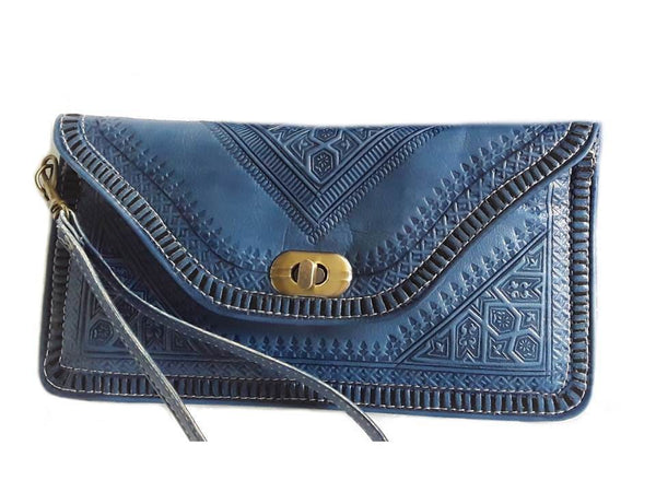 Gorgeous handcrafted wristlet clutch from Tetouan, Morocco. A colorful combination of tooled, embossed & woven leather make this clutch unique even among these types of clutches.