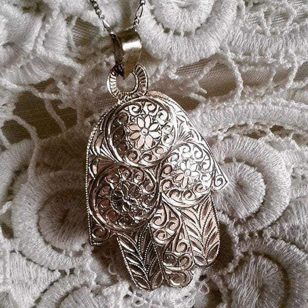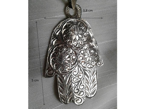 Beautiful Silver Hamsa Necklace from South Morocco. Engraved with flower designs.