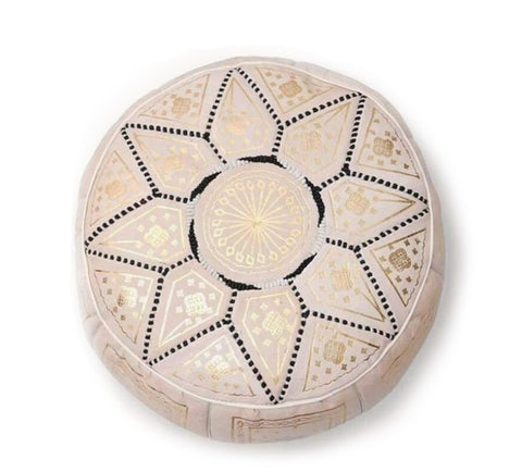 Moroccan Leather Ottoman / Pouf - Beige with golden motifs